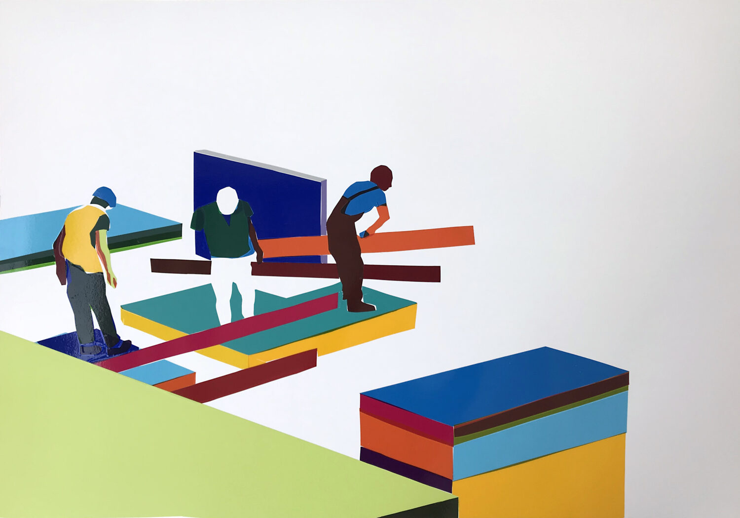 Mit diesen Collagen aus farbiger Fensterfolie auf Papier wollte ich ein Vexierspiel zwischen Figur und Grund, zwischen Szenerie und deren Auflösung schaffen. Die Motive sind angeregt durch die Komplexität der Formen auf städtischen Großbaustellen. Ich wollte die unübersichtliche Räumlichkeit und die Rolle des an- bzw. abwesenden Arbeiters darin ergründen. Die Reduktion der bildnerischen Mittel auf mal glänzende, mal matte Folie enthebt alle Formen ihrer materiellen Beschaffenheit und suggeriert eine irgendwie traumhaft, elegante Räumlichkeit, in der alles in einer „fast seeligen Stille, unbefragt, erstarrt, irgendwie erlöst“ (Zit. Michael Wüst) erscheint.