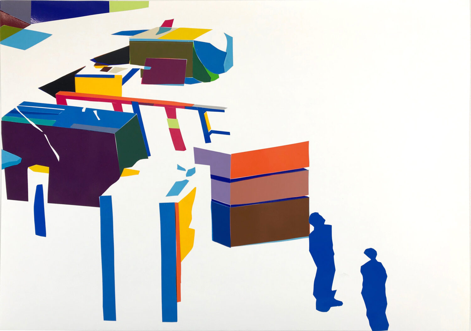 With these collages of colored window film on paper, I sought to create an enigmatic interplay between figure and ground, between a scene and its disintegration. The motifs are suggested by the complexity of forms in large urban construction sites. I wanted to explore the not clearly discernible spatiality and the role of works that are either present or absent. The reduction of the pictorial means to sometimes shiny, sometimes matte film releases all forms from their material properties and points towards a somehow dreamy, elegant spatiality in which everything appears in an “almost blissful stillness, unquestioned, motionless, somehow liberated.” (Michael Wüst)