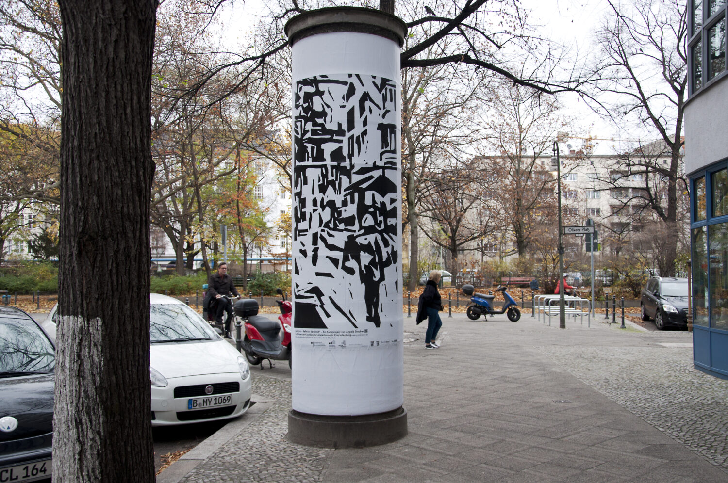 “With her project ‚The Reflection of the City,‘ Angela Stauber uses abstract graphic techniques to achieve a direct impact upon the everyday experiential world of the construct of the metropolis. The large-format posters planned by the artist and based on the linocuts created respectively for each individual site interrupt the often excessively object-oriented world of advertising surfaces and entice the viewer to a more attentive perception of the everyday urban environment, to a contemplation of its underlying social and economic constructs and their interrelationship in and with the urban space.” (excerpt from the jury decision)