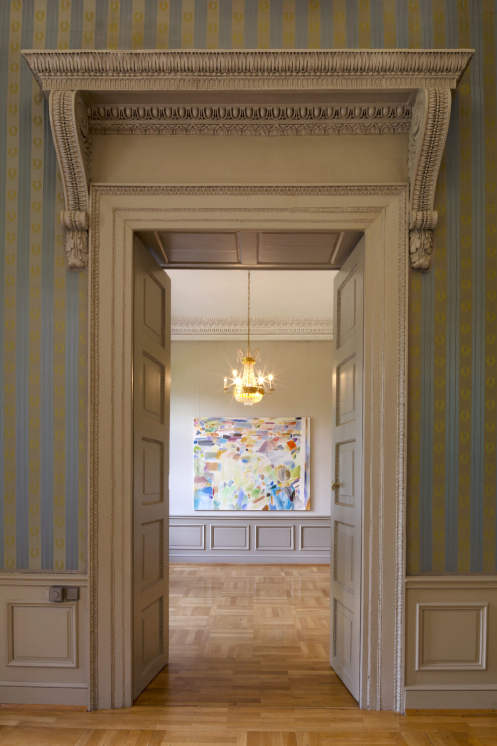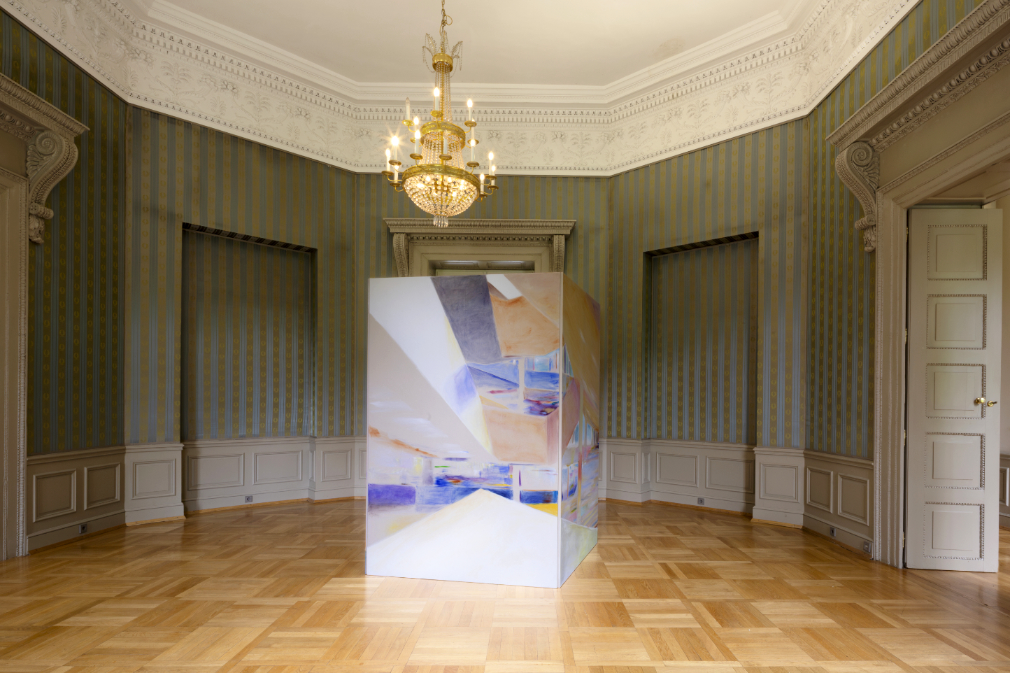 “Space we share” is not only the title of this exhibition in the castle pavilion in Ismaning, but also the name of this four-part work in the central room. It shows oversized modern architecture that is representative of so-called public space. Usable in principle by everyone, it raises the question of how much people can share a space at all. What influence does architecture have on a society? Here, a spatial cube with pointed edges and unequal side lengths stands in contrast to baroque symmetry. History and the present meet.