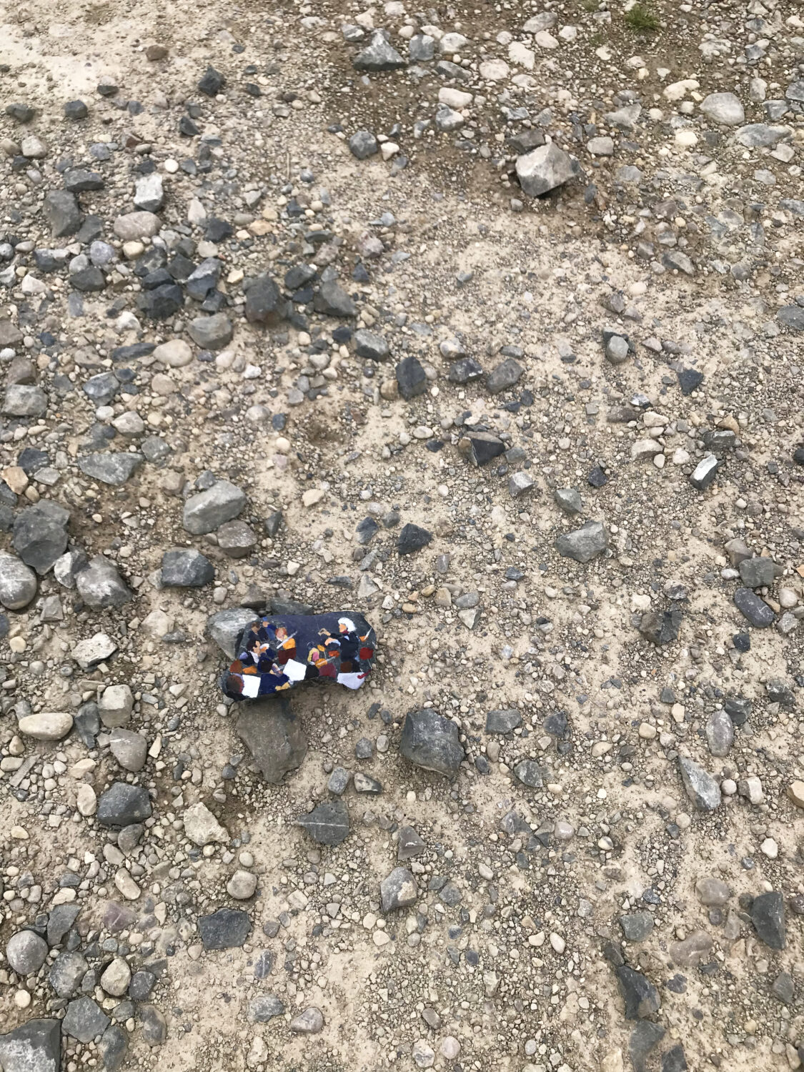 In dieser Situation kam mir die Idee, Material von der bislang ungenutzen Brachfläche mit den Visionen vom Orchesterklang zusammenzubringen. Ich sammelte also Steine verschiedener Größe und Art und malte darauf Bilder vom Symphonieorchester des Bayerischen Rundfunks. Sir Simon Rattle ist hier und da schemenhaft zu erkennen. Figuren, Klangkörper, gedämpftes Licht. Die körperhaften Steine schienen mir die ideale Projektionsfläche für die im Halbrund sitzenden Musiker zu sein. Und mit ihnen die immateriellen Wahrnehmungen von Klang und Raum. So sind 15 Steine mit abstrahierten Motiven entstanden. „Wenn Steine sprechen könnten“ erzählen sie nicht von dem, was sie schon alles gesehen haben, sondern davon, was eigentlich auf diesem Platz stattfinden könnte. Die bemalten Steine stellen die Umkehrung eines immersiven Erlebnisses dar: die große Klangwelt im Konzerthaus wird auf einen im Vergleich dazu winzigen Stein komprimiert.