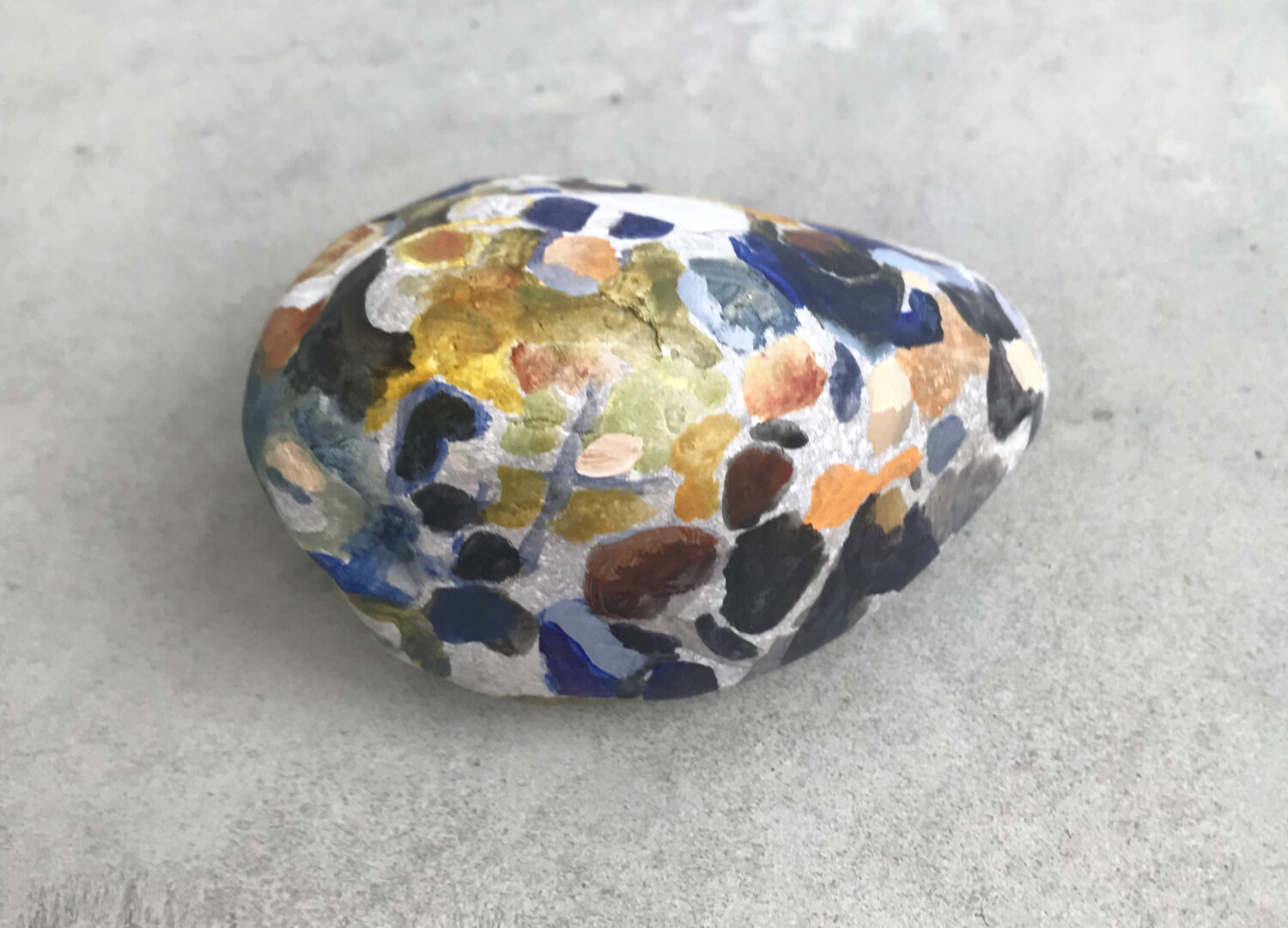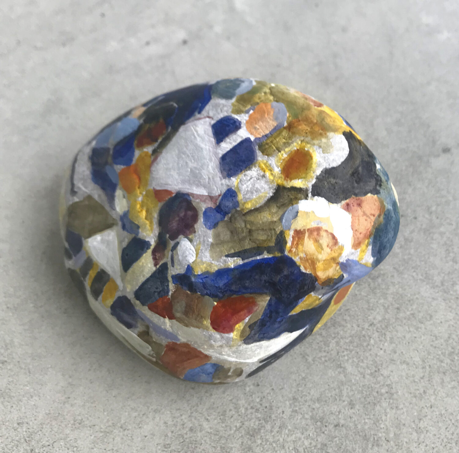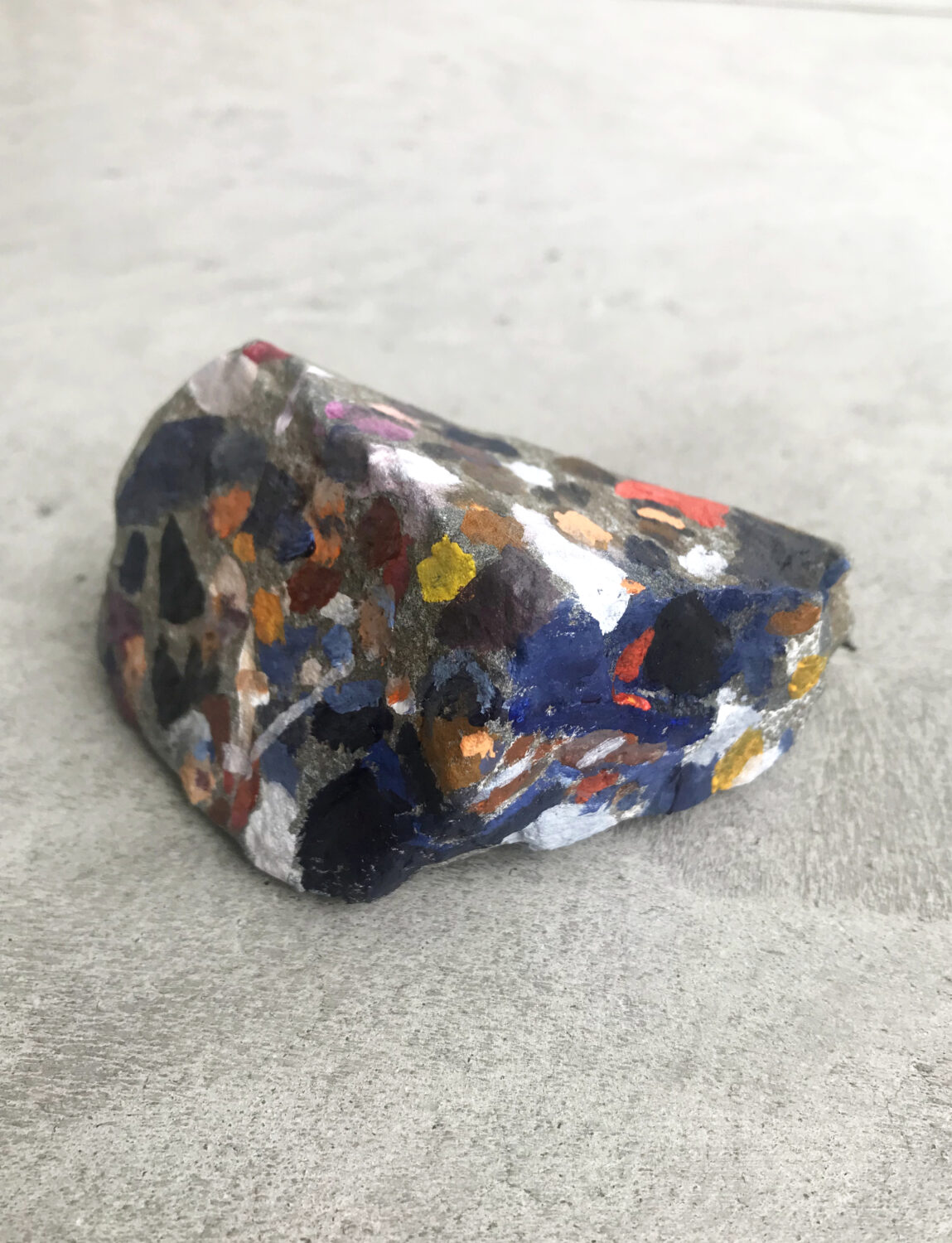 In this situation, the idea came to me to combine materials from the previously unused wasteland with visions of orchestral sound. So I collected stones of various sizes and types and painted images of the Bavarian Radio Symphony Orchestra on them. Sir Simon Rattle can be discerned here and there, albeit only vaguely. Figures, sound bodies, subdued light. The three-dimensional stones seemed to me the ideal projection surface for the musicians seated in a semicircle. And with them, the immaterial perceptions of sound and space. Thus, 15 stones with abstracted motifs were created. „If stones could speak,“ they don’t tell of what they have already witnessed, but rather of what could actually take place in this space. The painted stones represent the inversion of an immersive experience: the vast soundscape of the concert hall is compressed onto a comparatively tiny stone.