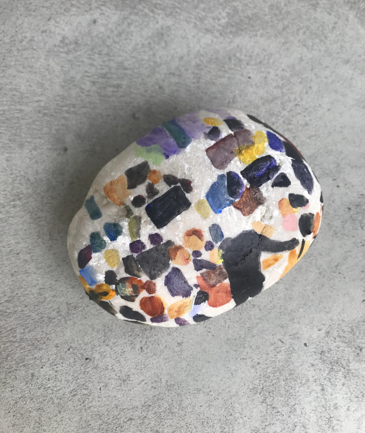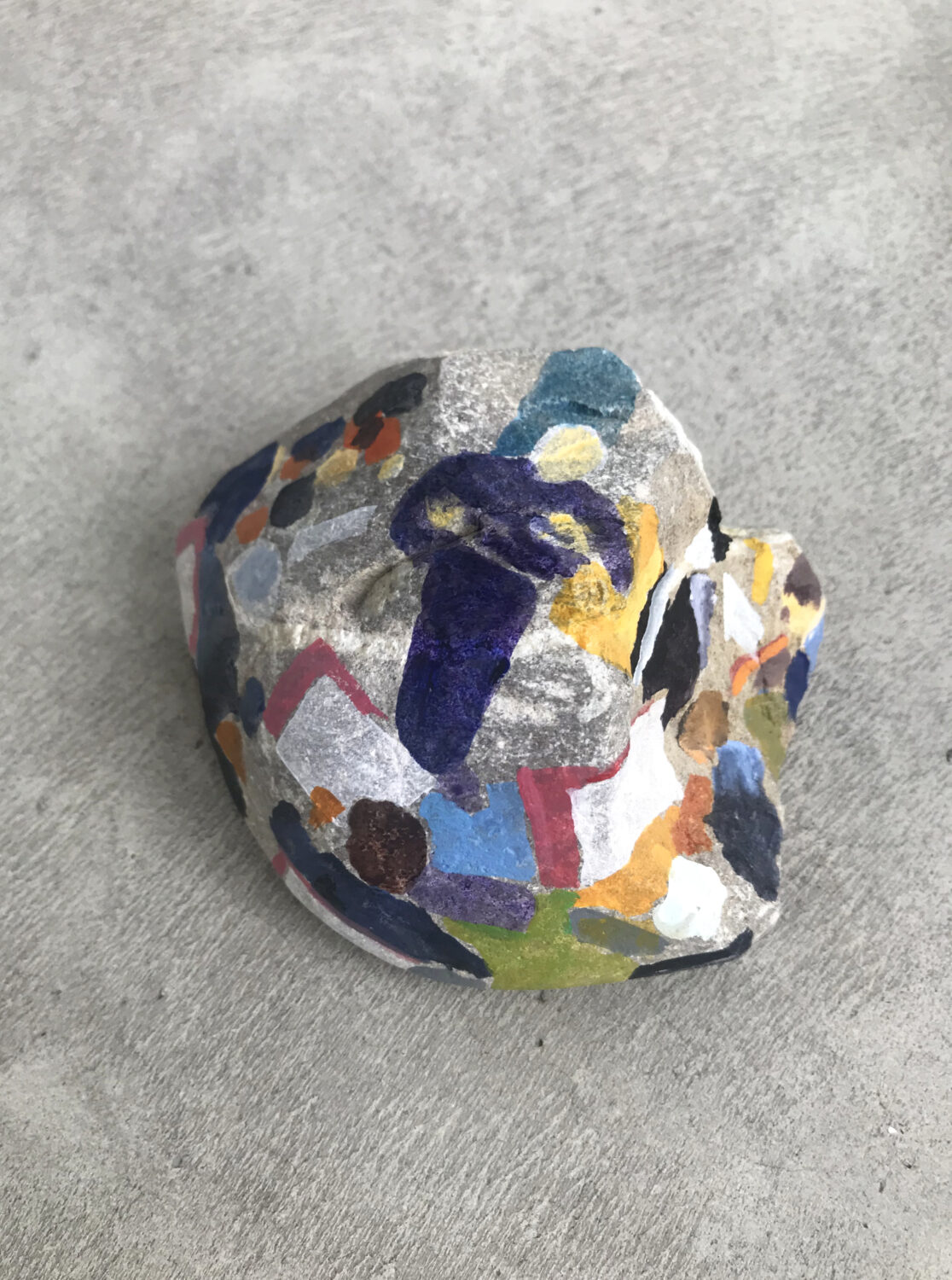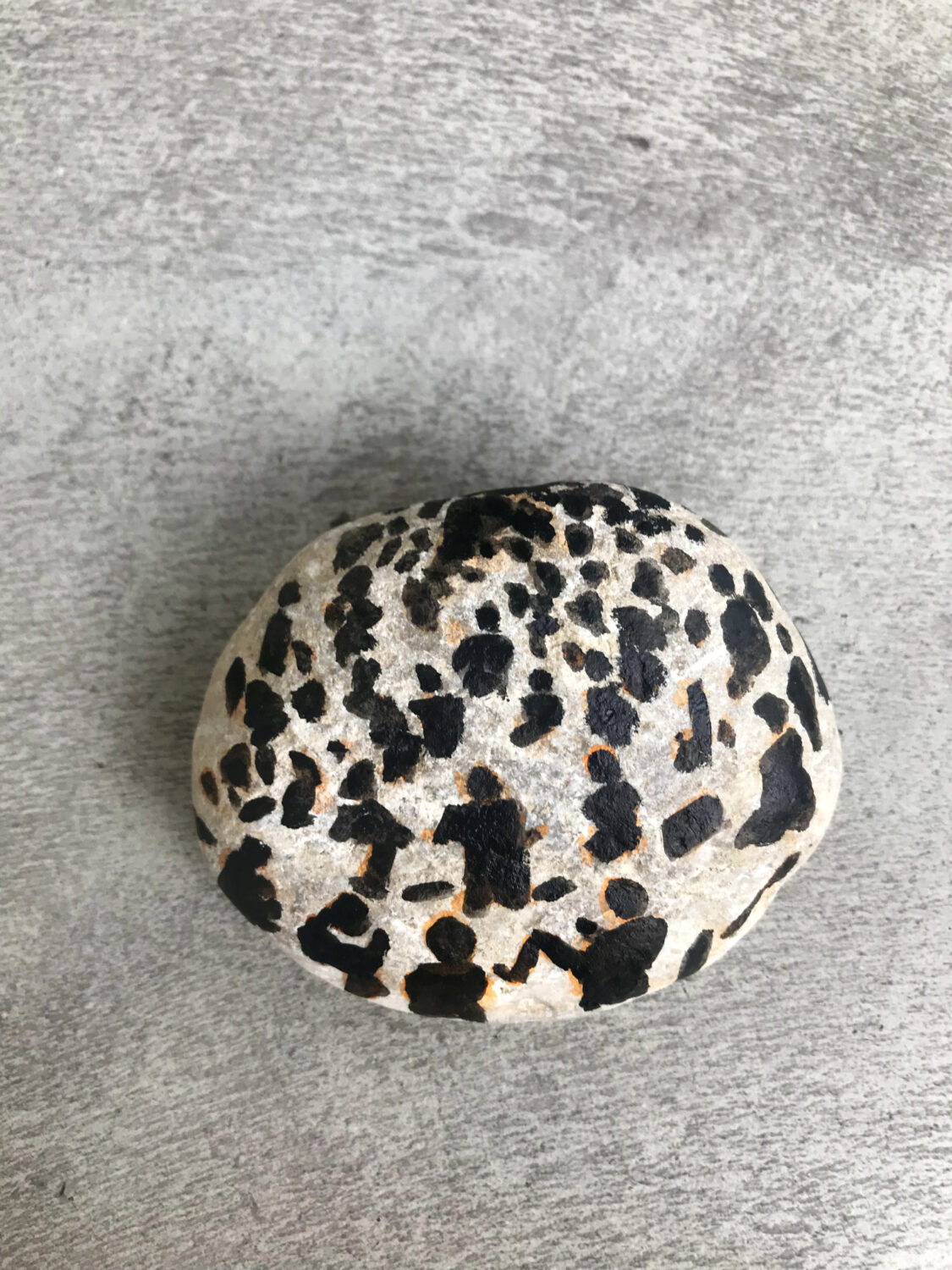In this situation, the idea came to me to combine materials from the previously unused wasteland with visions of orchestral sound. So I collected stones of various sizes and types and painted images of the Bavarian Radio Symphony Orchestra on them. Sir Simon Rattle can be discerned here and there, albeit only vaguely. Figures, sound bodies, subdued light. The three-dimensional stones seemed to me the ideal projection surface for the musicians seated in a semicircle. And with them, the immaterial perceptions of sound and space. Thus, 15 stones with abstracted motifs were created. „If stones could speak,“ they don’t tell of what they have already witnessed, but rather of what could actually take place in this space. The painted stones represent the inversion of an immersive experience: the vast soundscape of the concert hall is compressed onto a comparatively tiny stone.